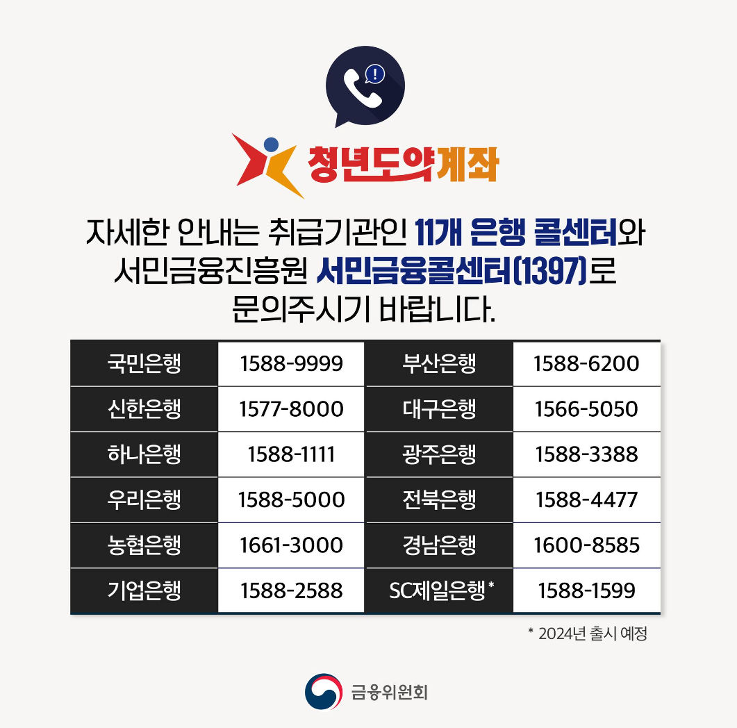 · 청년도약계좌 문의사항 : 서민금융진흥원 홈페이지나 오픈채팅방, 상담전화 (1397 -> 3번) 문의