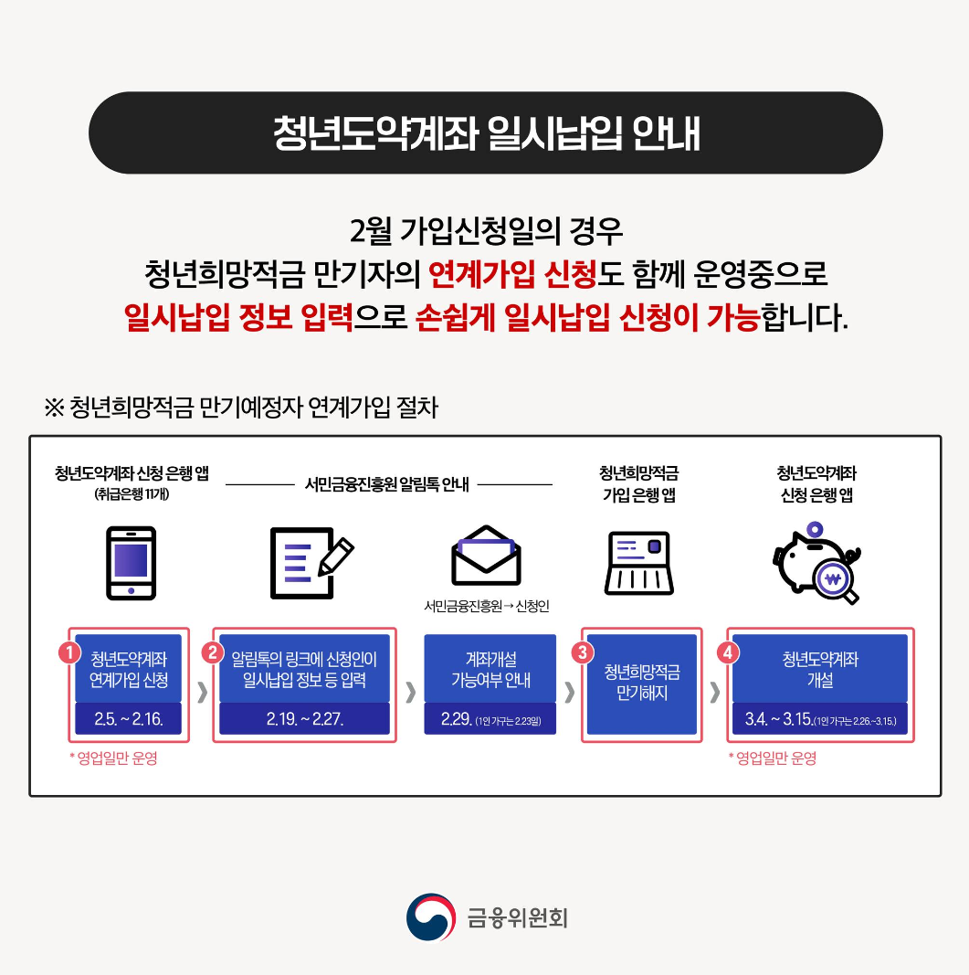 · 청년도약계좌 가입절차, 일시납입방법, 가입조건 문의사항 : 은행연합회 홈페이지