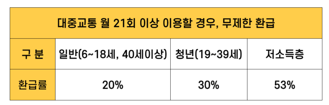 더 경기패스는 2024년 5월부터 시행될 예정으로 대중교통을 이용한 횟수와 연령에 따라 환급률이 다릅니다. 대중교통을 월 21회 이상 이용할 경우는 무제한으로 환급받을 수 있습니다. 대상자에 해당할 경우 최대 53%까지 환급받을 수 있습니다.