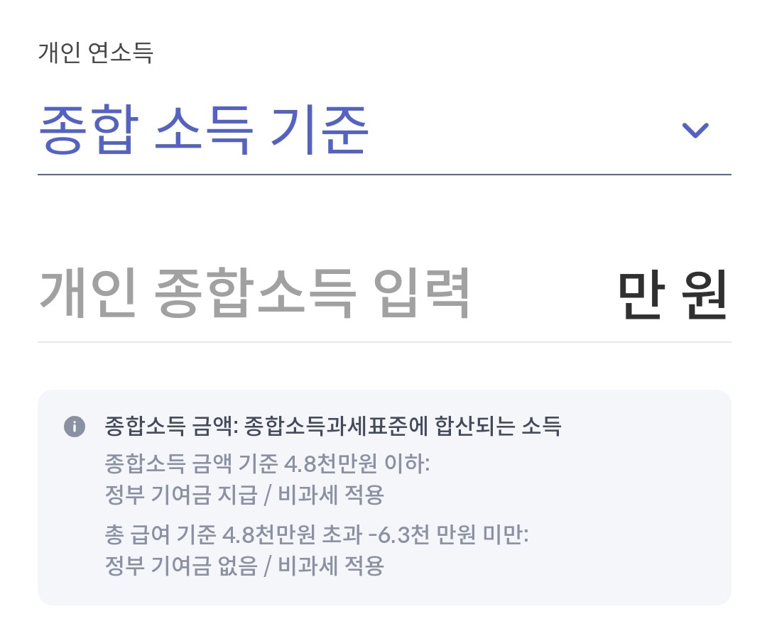 총 급여 기준 또는 종합 소득 기준으로 개인소득을 입력합니다. 자세한 총 급여액을 알아보는 방법은 국세청홈텍스에서 소득금액증명서('23.7월 이후 신청자의 경우, 22년도 기준확인) 내역을 확인하시면 됩니다. 만약에 '23년도 소득만 있으신 분은 '24년도 7월 이후에 신청할 수 있습니다.
