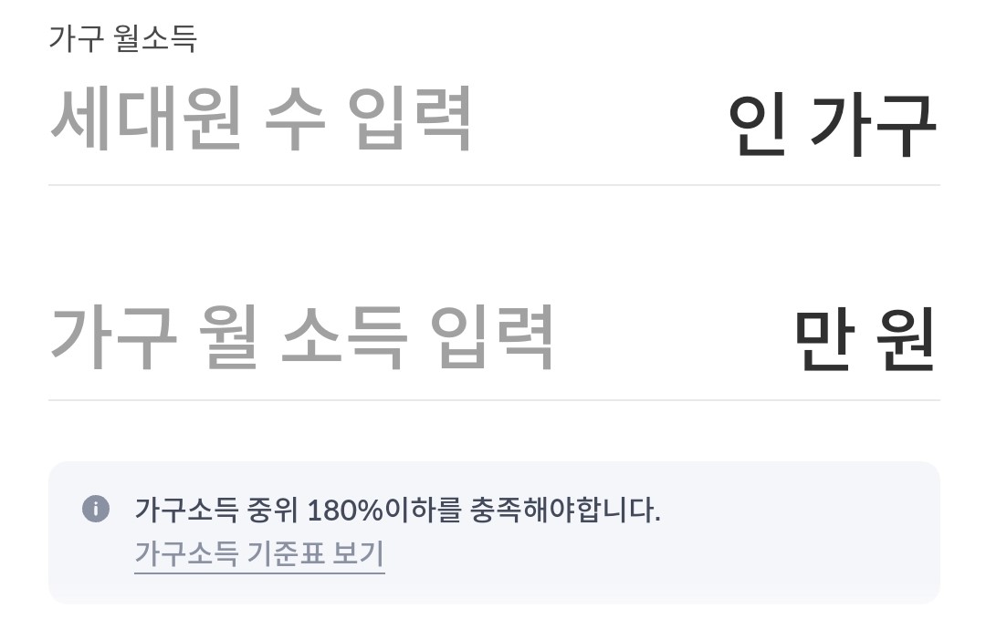 몇 인 가구인지와 월 소득을 입력해줍니다. 가구소득중위 180% 이하를 충족해야 가입이 가능합니다.