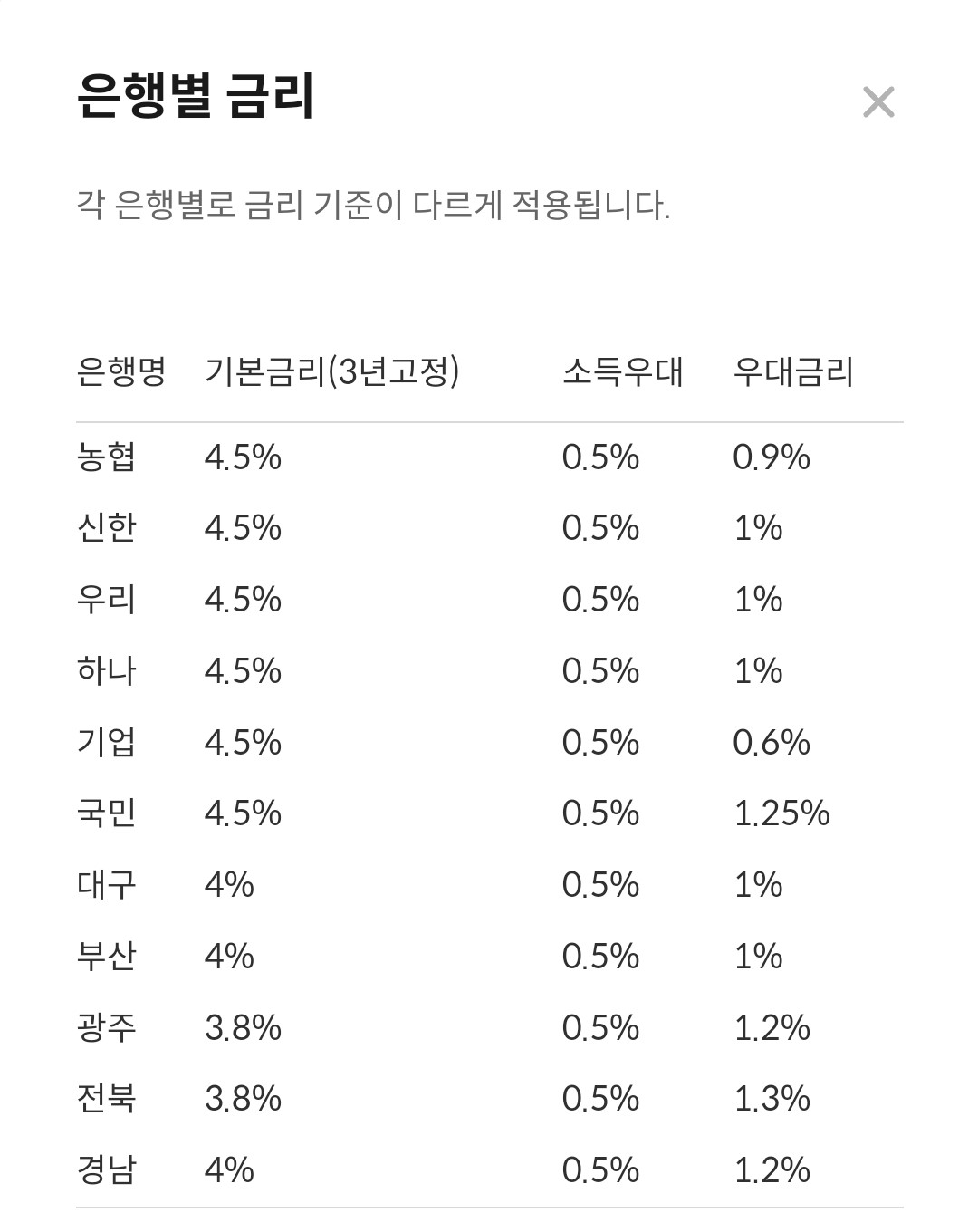 가입할 수 있는 은행 목록과 은행별 우대금리까지 확인할 수 있습니다. 대부분 4.5% 기본금리에 1% 우대금리를 적용받아, 5 ~ 5.5% 정도의 금리를 받을 수 있습니다.
