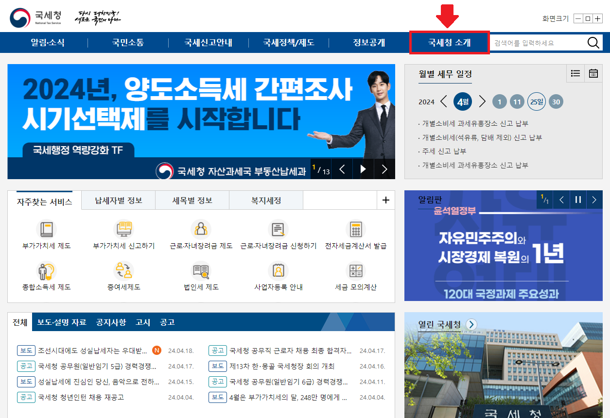 2. 오른쪽 상단 메뉴에서 "국세청 소개"를 클릭합니다.