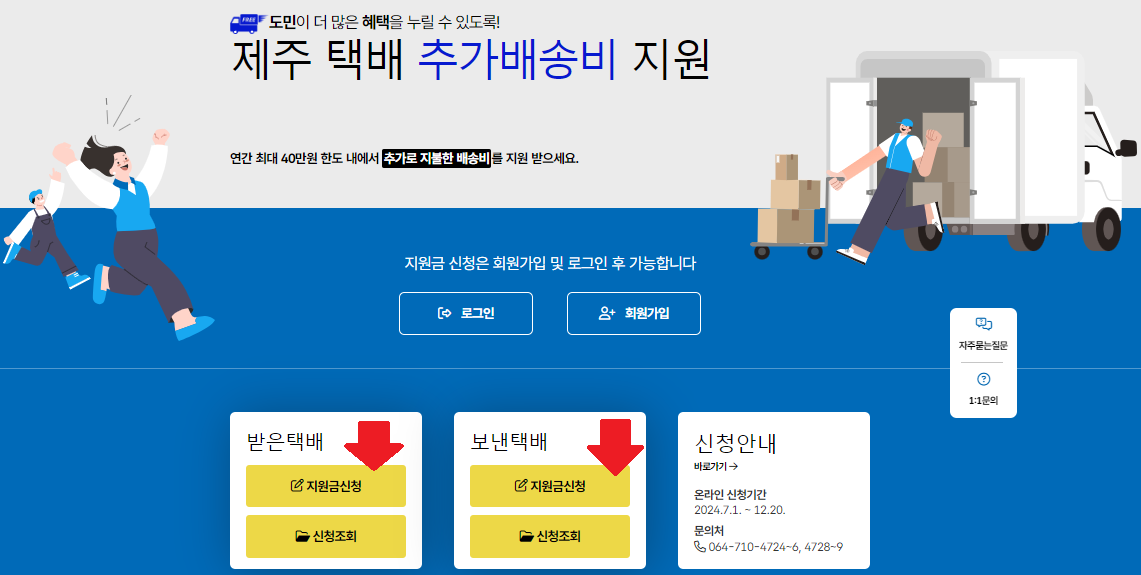 2) 제주 택배 추가배송비 지원 홈페이지(https://www.jeju.go.kr/delivery/)에서 받은택배, 보낸택배를 선택하고 지원금신청을 하시면됩니다. 지원금 신청은 반드시 회원가입을 해야 가능하니, 회원가입 후 로그인해서 진행해주시기 바랍니다.