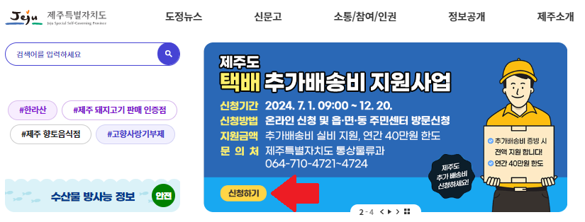 1) 홈페이지(https://www.jeju.go.kr/)에서 신청하기 버튼을 눌러 제주 택배 추가배송비 지원 사이트로 이동합니다.